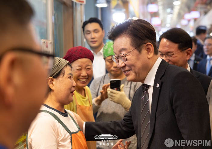 [서울=뉴스핌] 이재명 대통령이 5일 인천 미추홀구 용현시장을 찾아 상인들과 인사를 나누고 있다. [사진=대통령실] 2025.09.05 photo@newspim.com