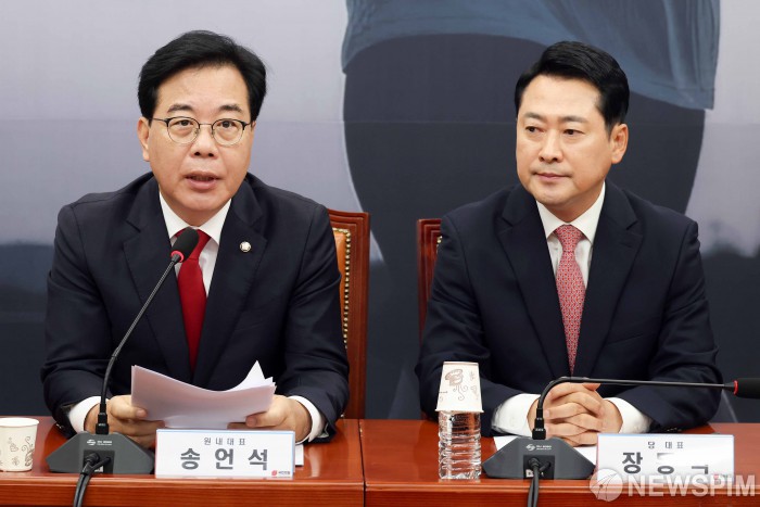 [서울=뉴스핌] 윤창빈 기자 = 송언석 국민의힘 원내대표가 8일 오전 서울 여의도 국회에서 열린 최고위원회의에서 모두발언을 하고 있다. 2025.09.08 pangbin@newspim.com