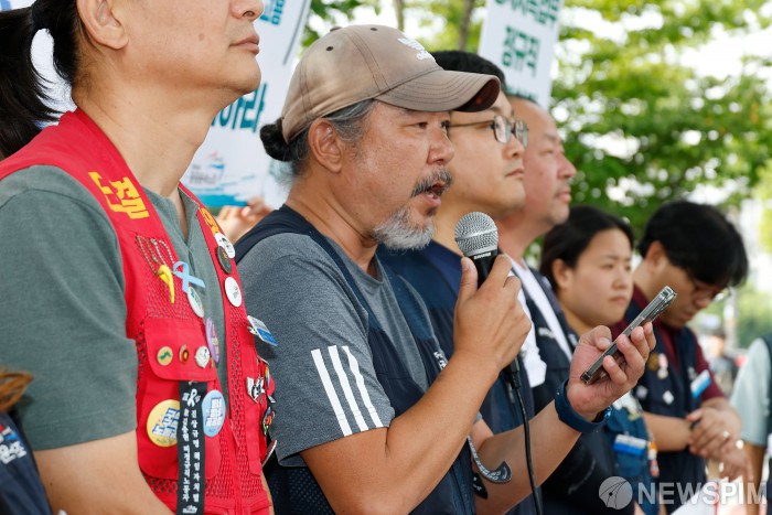 [서울=뉴스핌] 류기찬 기자 = 김선종 공공운수노조 부위원장이 8일 오전 서울 용산구 대통령실 앞에서 열린 ‘비정규직 노동자 대책 수립 촉구 기자회견'에서 발언을 하고 있다. 2025.09.08 ryuchan0925@newspim.com