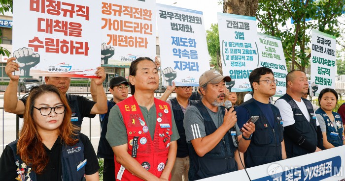 [서울=뉴스핌] 류기찬 기자 = 김선종 공공운수노조 부위원장이 8일 오전 서울 용산구 대통령실 앞에서 열린 ‘비정규직 노동자 대책 수립 촉구 기자회견'에서 발언을 하고 있다. 2025.09.08 ryuchan0925@newspim.com