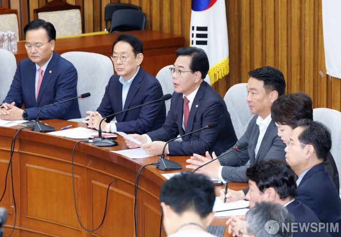 [서울=뉴스핌] 윤창빈 기자 = 송언석 국민의힘 원내대표가 9일 오전 서울 여의도 국회에서 열린 원내대책회의에서 모두발언을 하고 있다. 2025.09.09 pangbin@newspim.com