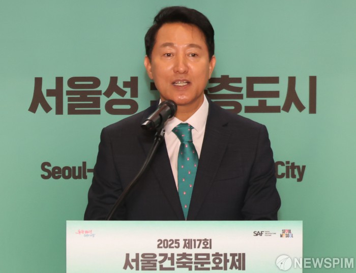 [서울=뉴스핌] 양윤모 기자 = 오세훈 서울시장이 9일 오후 종로구 푸투라서울에서 개최된 '2025 제17회 서울건축문화제' 개막행사에 참석 인사말을 하고 있다. 2025.09.09 yym58@newspim.com