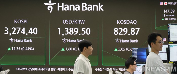 [서울=뉴스핌] 양윤모 기자 = 주식 양도세 대주주 기준 완화 기대감에 10일 오전 코스피가 전장 종가보다 14.35 포인트(0.44%) 상승하며 3274.40으로, 코스닥은 5.05 포인트(0.62%) 상승한 829.87로 장을 시작한 가운데, 서울 중구 하나은행 딜링룸에서 직원들이 업무를 보고 있다. 서울외환시장에서 원·달러 환율은 전장 대비 1.60원 상승한 1389.50원에 거래를 시작했다. 2025.09.10 yym58@newspim.com