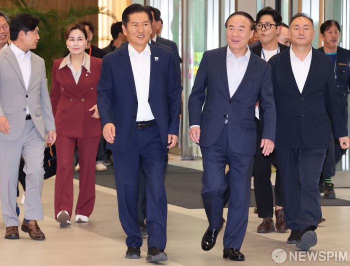 [평택=뉴스핌] 국회사진기자단 = 정청래 더불어민주당 대표가 10일 경기 평택시 삼성전자 팽택캠퍼스를 방문해 전영현 삼성전자 디바이스솔루션(DS)부문장(부회장)의 안내를 받으며 들어서고 있다. 2025.09.10 photo@newspim.com