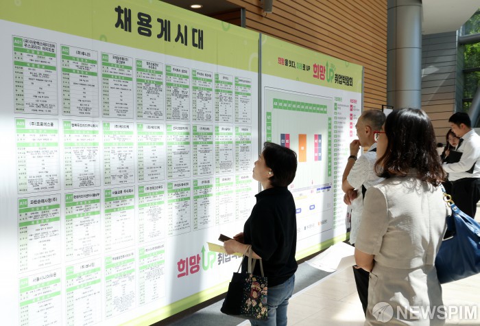 [서울=뉴스핌] 정일구 기자 = 11일 오후 서울 영등포구 FKI타워 컨퍼런스센터에서 열린 '2025 희망 업(UP) 취업박람회'에서 구직자들이 채용게시대를 살펴보고 있다. 한국경제인협회 중소기업협력센터와 영등포구청이 공동 개최한 이번 행사는 중장년 고용 확대와 경력 단절 해소, 지역 일자리 창출을 목표로 마련됐다. 2025.09.11 mironj19@newspim.com