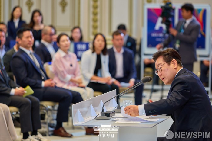 [서울=뉴스핌] 이재명 대통령이 11일 서울 종로구 청와대 영빈관에서 열린 취임 100일 기자회견에서 자료를 확인하고 있다. [사진=대통령실] 2025.09.11 photo@newspim.com