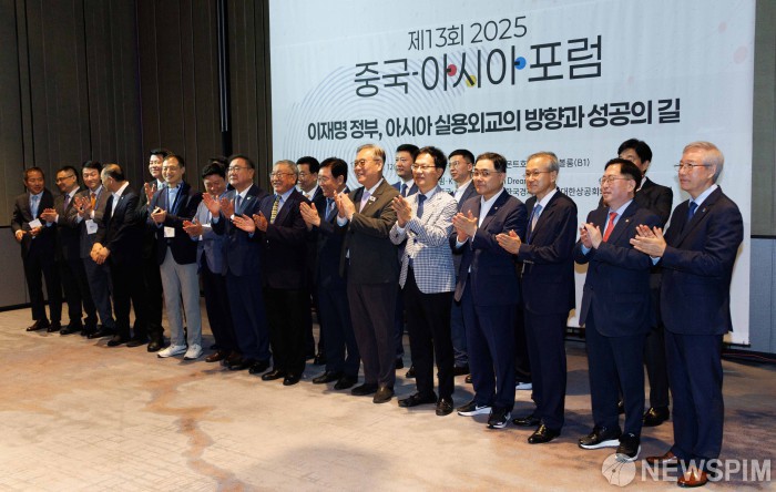 [서울=뉴스핌] 윤창빈 기자 = 민병복 뉴스핌 회장과 내빈들이 12일 오전 서울 여의도 페어몬트호텔 그랜드볼룸에서 종합뉴스통신사 뉴스핌 주최로 열린 제13회 2025 중국·아시아 포럼에서 기념촬영을 하고 있다. '이재명 정부, 아시아 실용외교의 방향과 성공의 길'을 주제로 열린 이번 포럼은 중국, 일본, 인도, 베트남 등 아시아 국가들과의 경제·문화 협력 상황을 점검하고 발전 방안을 찾기 위해 마련됐다. 2025.09.12 pangbin@newspim.com