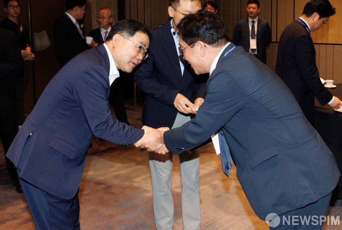 [서울=뉴스핌] 윤창빈 기자 = 민병복 뉴스핌 회장, 허성무 더불어민주당 의원이 12일 오전 서울 여의도 페어몬트호텔 그랜드볼룸에서 종합뉴스통신사 뉴스핌 주최로 열린 제13회 2025 중국·아시아 포럼에서 인사를 나누고 있다. '이재명 정부, 아시아 실용외교의 방향과 성공의 길'을 주제로 열린 이번 포럼은 중국, 일본, 인도, 베트남 등 아시아 국가들과의 경제·문화 협력 상황을 점검하고 발전 방안을 찾기 위해 마련됐다. 2025.09.12 pangbin@newspim.com