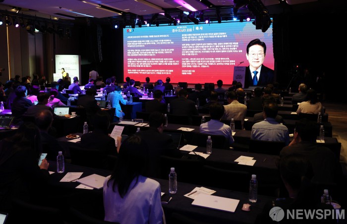[서울=뉴스핌] 정일구 기자 = 12일 오전 서울 여의도 페어몬트호텔 그랜드볼룸에서 종합뉴스통신사 뉴스핌 주최로 열린 제13회 2025 중국·아시아 포럼에서 이재명 대통령의 서면 축사가 공개되고 있다. '이재명 정부, 아시아 실용외교의 방향과 성공의 길'을 주제로 열린 이번 포럼은 중국, 일본, 인도, 베트남 등 아시아 국가들과의 경제·문화 협력 상황을 점검하고 발전 방안을 찾기 위해 마련됐다. 2025.09.12 mironj19@newspim.com