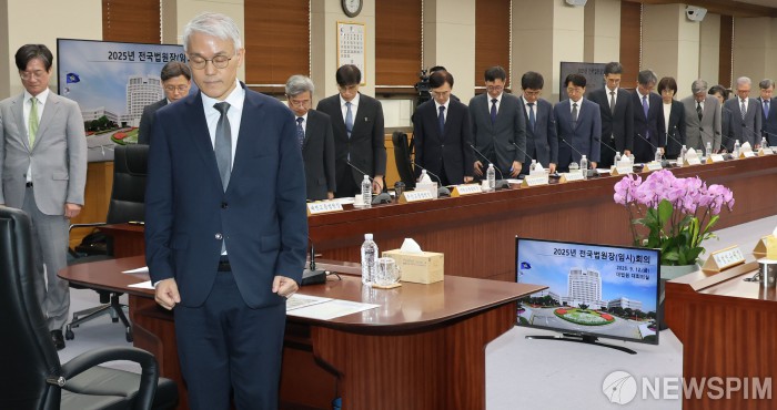 [서울=뉴스핌] 양윤모 기자 = 정부·여당이 사법개혁 법안 처리에 속도를 내는 가운데, 전국법원장회의 임시회의가 12일 오후 서울 서초구 대법원 대회의실 401호에서 천대엽 법원행정처장이 참석한 가운데 열렸다. 전국법원장회의는 대법원을 제외한 각급 법원장, 사법연수원장, 사법정책연구원장, 법원공무원교육원장 등 최고위 법관이 모이는 회의다. 2025.09.12 yym58@newspim.com