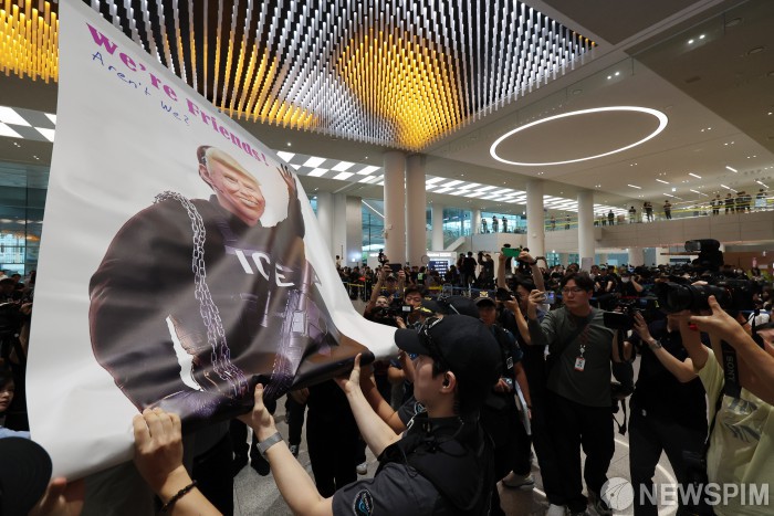 [영종도=뉴스핌] 김학선 기자 = 미국 이민당국에 의해 조지아주에 구금됐던 한국인 300여 명이 귀국한 12일 오후 인천국제공항 제2여객터미널 입국장에서 도널드 트럼프 미국 대통령 얼굴 배너를 든 시민단체가 시위를 하고 있다. 2025.09.12 yooksa@newspim.com