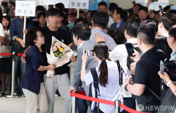 [영종도=뉴스핌] 김학선 기자 = 미국 이민당국에 의해 조지아주에 구금됐다가 석방된 한국인 근로자들이 12일 오후 인천국제공항을 통해 귀국해 가족들과 인사를 나누고 있다. 2025.09.12 yooksa@newspim.com