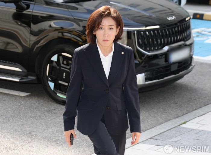 [서울=뉴스핌] 정일구 기자 = 나경원 국민의힘 의원이 15일 오전 서울 양천구 서울남부지방법원에서 열린 '국회 패스트트랙(신속처리안건) 충돌 사건' 관련 1심 결심 공판에 출석하고 있다. 2025.09.15 mironj19@newspim.com