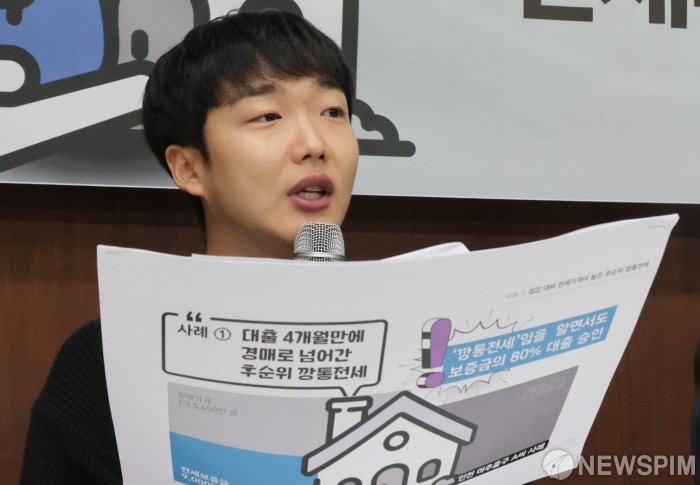 [서울=뉴스핌] 양윤모 기자 = 참여연대가 16일 오전 서울 종로구 참여연대 아름드리홀에서 '전세대출 피해 사례 발표' 기자회견을 하고 있다. 행사에서 참석자들은 다가구 후순위, 신탁, 위반 건축물 등의 전세대출 피해 사례를 발표하고, 전세대출의 문제점과 개선방안을 제시했다.이 자리에는 박효주 참여연대 주거조세팀장,김은정 참여연대 협동사무처장,임재만 참여연대 민생희망본부 실행위원,최하은 민달팽이유니온 상임활동가와 전세대출 피해자가 참석했다. 2025.09.16 yym58@newspim.com