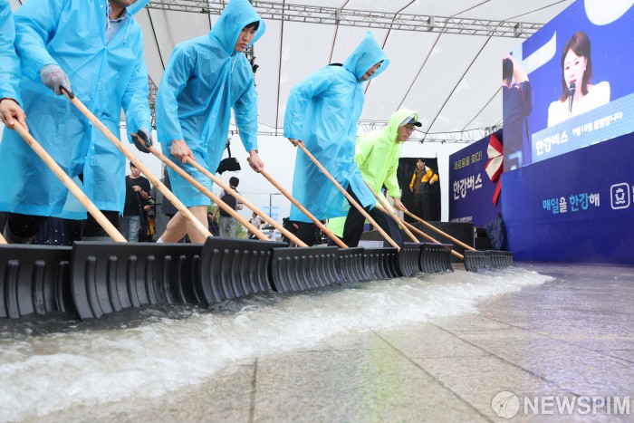 [서울=뉴스핌] 김학선 기자 = 폭우가 내린 17일 서울 영등포구 한강버스 여의도선착장에서 열린 한강버스 취항식장에 물이 차 관계자가 바닥을 쓸고 있다. 2025.09.17 yooksa@newspim.com
