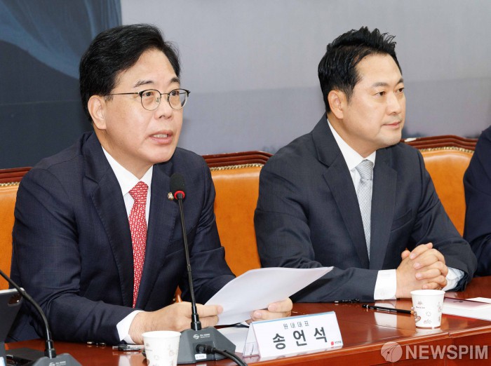[서울=뉴스핌] 윤창빈 기자 = 송언석 국민의힘 원내대표가 18일 오전 서울 여의도 국회에서 열린 최고위원회의에서 모두발언을 하고 있다. 2025.09.18 pangbin@newspim.com