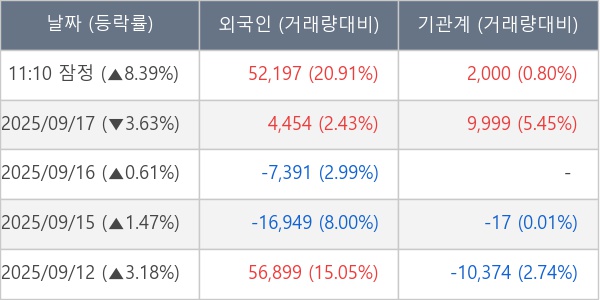 [장중수급포착] 엘오티베큠, 외국인/기관 동시 순매수… 주가 +8.39%