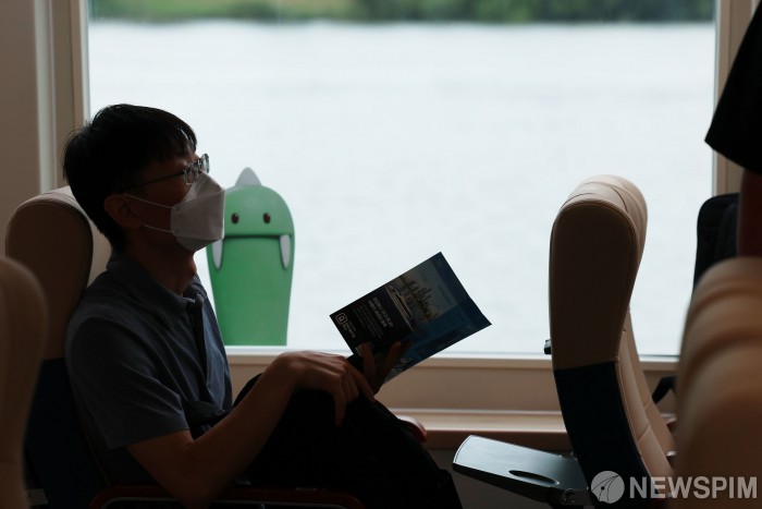 [서울=뉴스핌] 류기찬 기자 = 한강버스 시승식에 참여한 한 탑승객이 18일 오전 서울 영등포구 여의도 선착장에서 뚝섬 선착장으로 향하는 한강버스 정식 운항 기념 시승식을 체험하고 있다. 2025.09.18 ryuchan0925@newspim.com