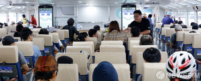 [서울=뉴스핌] 류기찬 기자 = 한강버스 정식 운항 첫날인 18일 오전 서울 강서구 한강버스 마곡선착장에서 출발한 한강버스가 탑승객들로 붐비고 있다. 2025.09.18 ryuchan0925@newspim.com