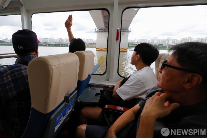 [서울=뉴스핌] 류기찬 기자 = 한강버스 정식 운항 첫날인 18일 오전 서울 강서구 한강버스 마곡선착장에서 출발한 한강버스 내에서 시민들이 경치를 즐기고 있다. 2025.09.18 ryuchan0925@newspim.com