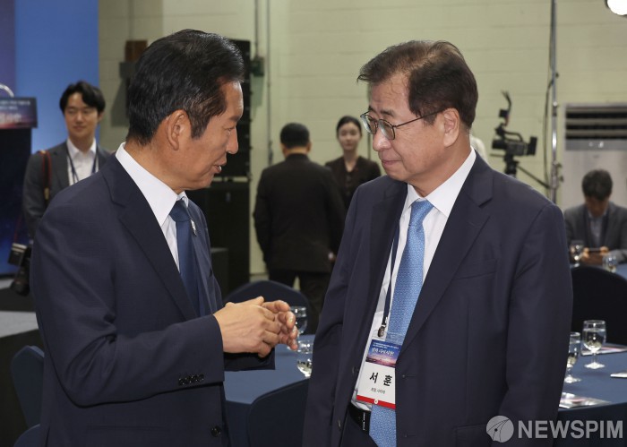 [파주=뉴스핌] 국회사진기자단 = 정청래 더불어민주당 대표와 서훈 전 국가정보원장이 19일 경기 파주시 캠프그리브스 열린 9.19 평양공동선언 7주년 기념행사에서 대화를 나누고 있다. 2025.09.19 photo@newspim.com