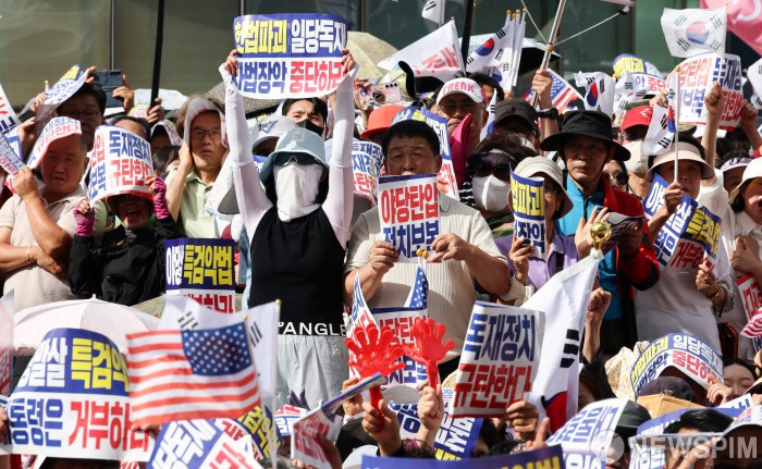 [대구=뉴스핌] 최지환 기자 = 국민의힘 당원과 지지자들이 21일 오후 대구 동구 동대구역 광장에서 국민의힘이 주최한 야당탄압·독재정치 국민 규탄대회를 열고 있다. 2025.09.21 choipix16@newspim.com