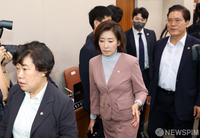 [서울=뉴스핌] 정일구 기자 = 나경원 국민의힘 의원 등 법사위원들이 22일 오전 서울 여의도 국회 법제사법위원회에서 열린 검찰개혁 입법청문회에서 정회가 선언되자 회의장을 나서고 있다. 2025.09.22 mironj19@newspim.com