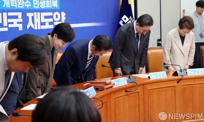 [서울=뉴스핌] 정일구 기자 = 정청래 더불어민주당 대표와 김병기 원내대표를 비롯한 최고위원들이 22일 오후 서울 여의도 국회에서 열린 최고위원회의에서 인사를 하고 있다. 2025.09.22 mironj19@newspim.com