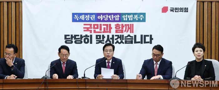 [서울=뉴스핌] 최지환 기자 = 송언석 국민의힘 원내대표가 23일 오전 서울 여의도 국회에서 열린 원내대책회의에서 모두발언을 하고 있다. 2025.09.23 choipix16@newspim.com