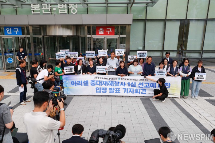 [수원=뉴스핌] 류기찬 기자 = 공장 화재사고로 23명의 사망자를 낸 아리셀 박순관 대표의 1심 선고가 내려진 23일 오후 경기도 수원시 영통구 수원지방법원에서 유가족 및 시민단체 회원들이 기자회견을 열고 있다. 수원지법 형사14부는 이날 중대재해 처벌 등에 관한 법률(산업재해치사) 위반, 파견법 위반, 산업안전보건법 위반 등의 혐의로 기소된 박 대표에게 징역 15년을 선고했다. 이는 2022년 중대재해처벌법이 시행된 이후 기소된 사건에서 내려진 최고 형량이다. 2025.09.23 ryuchan0925@newspim.com