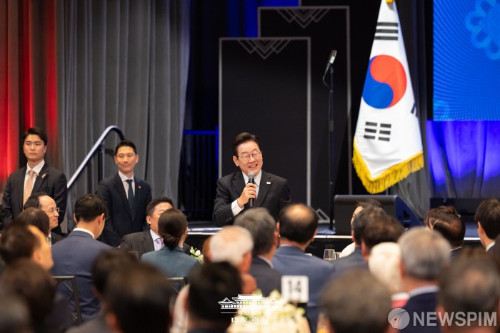 [서울=뉴스핌] 이재명 대통령이 지난 22일(현지시간) 미국 뉴욕의 한 호텔에서 열린 동포 간담회에서 발언을 하고 있다. [사진=대통령실] 2025.09.24 photo@newspim.com