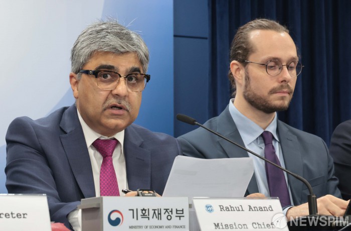 [서울=뉴스핌] 이길동 기자 = 라훌 아난드 IMF 한국 미션단장이 24일 서울 종로구 정부서울청사에서 2025년 국제통화기금(IMF)연례협의 결과를 발표하고 있다. 2025.09.24 gdlee@newspim.com