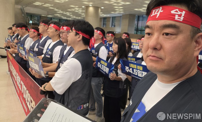 [서울=뉴스핌] 양윤모 기자 = 전국금융산업노동조합(금융노조)이 24일 오후 서울 중구 은행회관 앞에서 김형선 위원장이 참석한 가운데, 주 4.5일제 시행과 임금 인상 등을 요구하는 9.26 총파업 돌입 기자회견을 개최하고 있다. 금융노조는 오는 26일 광화문 세종대로에서 총파업을 예고했으며 은행원들이 거리로 나서는 은행권 총파업은 2022년 9월 이후 약 3년 만이다. 2025.09.24 yym58@newspim.com