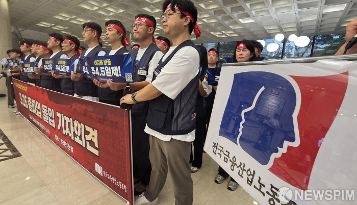 [서울=뉴스핌] 양윤모 기자 = 전국금융산업노동조합(금융노조)이 24일 오후 서울 중구 은행회관 앞에서 김형선 위원장이 참석한 가운데, 주 4.5일제 시행과 임금 인상 등을 요구하는 9.26 총파업 돌입 기자회견을 개최하고 있다. 금융노조는 오는 26일 광화문 세종대로에서 총파업을 예고했으며 은행원들이 거리로 나서는 은행권 총파업은 2022년 9월 이후 약 3년 만이다. 2025.09.24 yym58@newspim.com