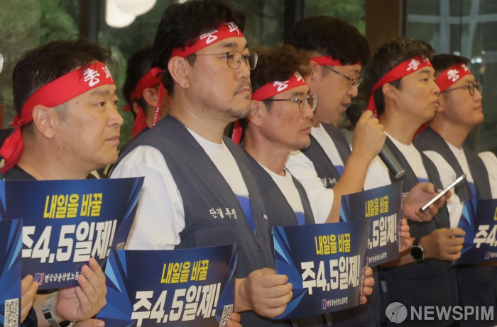 [서울=뉴스핌] 양윤모 기자 = 전국금융산업노동조합(금융노조)이 24일 오후 서울 중구 은행회관 앞에서 김형선 위원장이 참석한 가운데, 주 4.5일제 시행과 임금 인상 등을 요구하는 9.26 총파업 돌입 기자회견을 개최하고 있다. 금융노조는 오는 26일 광화문 세종대로에서 총파업을 예고했으며 은행원들이 거리로 나서는 은행권 총파업은 2022년 9월 이후 약 3년 만이다. 2025.09.24 yym58@newspim.com