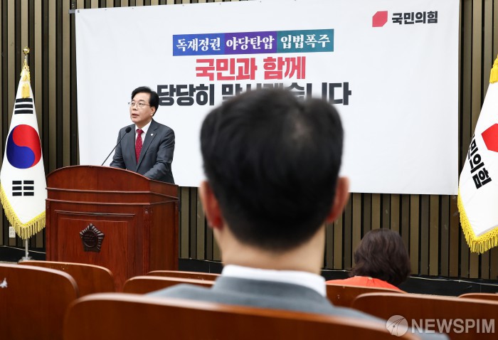 [서울=뉴스핌] 최지환 기자 = 송언석 국민의힘 원내대표가 24일 오후 서울 여의도 국회에서 열린 국민의힘 의원총회에서 발언하고 있다. 2025.09.24 choipix16@newspim.com