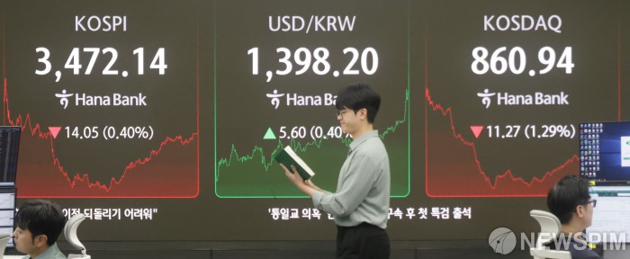 [서울=뉴스핌] 양윤모 기자 = 24일 오후 코스피가 전장 종가보다 14.05 포인트(0.40%) 하락하며 3472.14로, 코스닥은 11.27 포인트(1.29%) 하락한 860.94로 장을 마감한 가운데, 서울 중구 하나은행 딜링룸에서 직원들이 업무를 보고 있다. 서울외환시장에서 원·달러 환율은 전장 대비 5.60원 상승한 1398.20원에 거래를 마감했다. 2025.09.24 yym58@newspim.com