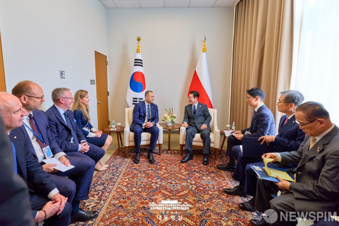 [서울=뉴스핌] 이재명 대통령과 카롤 나브로츠키 폴란드 대통령이 지난 24일(현지시간) 미국 뉴욕 유엔본부에서 정상회담을 하고 있다. [사진=대통령실] 2025.09.26 photo@newspim.com