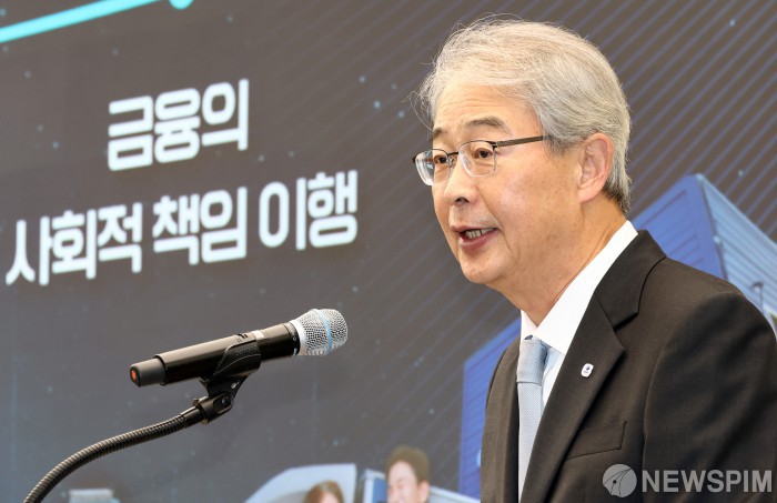 [서울=뉴스핌] 최지환 기자 = 임종룡 우리금융지주 회장이 29일 오전 서울 중구 우리은행 본점에서 열린 '우리금융 미래동반성장 프로젝트' 그룹 CEO 합동 브리핑에서 발표를 하고 있다. 2025.09.29 choipix16@newspim.com