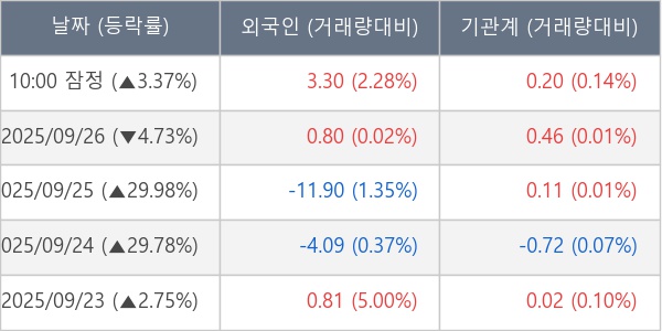 [서울=뉴스핌] 로보뉴스 = 29일 10시 15분 현재 에스엠벡셀(010580)은 외국인과 기관이 각각 3.30 만 주, 0.20 만 주 순매수(잠정) 하면서 전일 대비 3.37% (현재가 2,605원) 상승하고 있다.