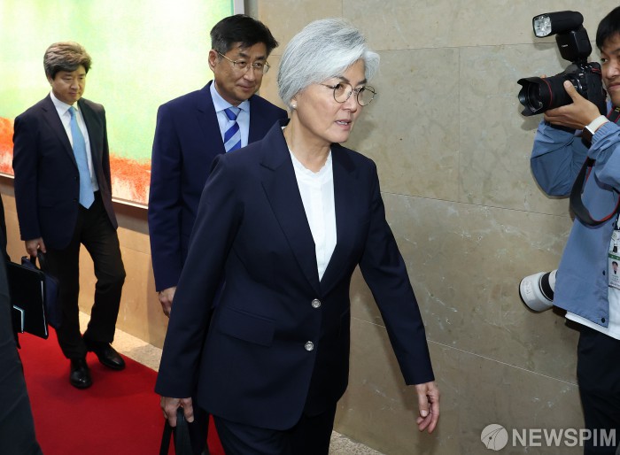 [서울=뉴스핌] 정일구 기자 = 강경화 주미대사 내정자가 29일 오후 서울 여의도 국회에서 우원식 국회의장을 접견하기 위해 이동하고 있다. 2025.09.29 mironj19@newspim.com
