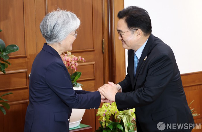 [서울=뉴스핌] 정일구 기자 = 우원식 국회의장이 29일 오후 서울 여의도 국회에서 강경화 주미대사 내정자를 접견하고 있다. 2025.09.29 mironj19@newspim.com