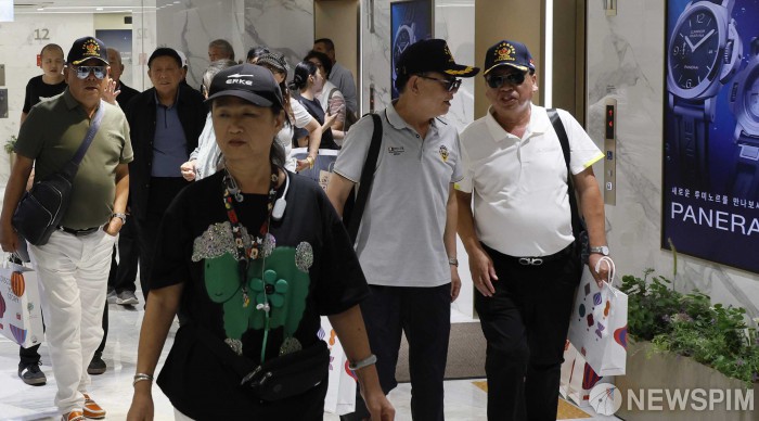 [서울=뉴스핌] 양윤모 기자 = 중국 단체관광객의 무비자 입국 첫날인 29일 서울 중구 롯데면세점을 방문한 중국관광객들이 쇼핑을 마치고 이동하고 있다. 3명 이상 중국인 단체관광객은 29일부터 무비자로 최대 15일 동안 대한민국 전역을 여행할 수 있다. 2025.09.29 yym58@newspim.com