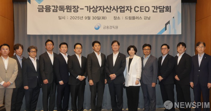 [서울=뉴스핌] 양윤모 기자 = 이찬진 금감원장이 30일 오후 서울 강남구 드림플러스에서 개최된 '금융감독원장-가상자산사업자 CEO 간담회'에 참석 기념촬영을 하고 있다. 이번 간담회는 빗썸을 제외한 업비트, 코인원, 코빗, 고팍스 등 주요 가상자산 거래소 CEO와 디지털자산 거래소협의체(닥사, DAXA) 부회장 등이 참석했다. 2025.09.30 yym58@newspim.com