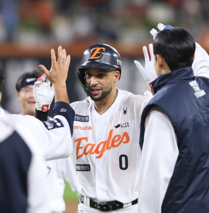[서울=뉴스핌] 한화의 외국인 타자 리베라토가 지난 9월 30일 롯데와의 경기에서 끝내기 안타를 기록한 뒤 선수들과 하이파이브를 하고 있다. [사진 = 한화] 2025.10.01 wcn05002@newspim.com