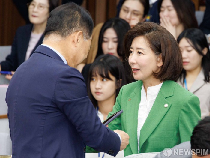 [서울=뉴스핌] 윤창빈 기자 = 나경원 국민의힘 의원이 1일 오전 서울 여의도 국회에서 열린 상임위원장 및 간사단 회의에서 인사를 나누고 있다. 2025.10.01 pangbin@newspim.com