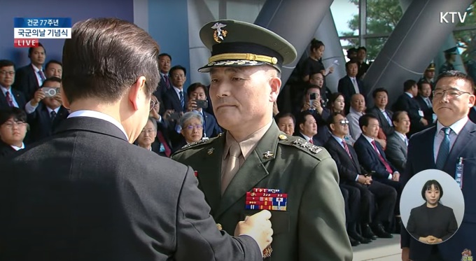 이재명 대통령이 1일 오전 취임 후 첫 국군의 날 기념식에서 박정훈 해병대 대령에게 헌법적 가치와 민주주의 수호에 기여한 공로로 보국훈장 삼일장을 직접 수여하고 있다. [사진=KTV]