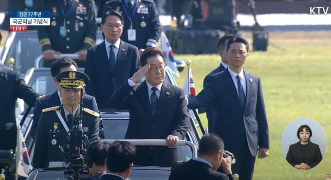 이재명 대통령이 1일 오전 취임 후 첫 국군의 날을 맞아 육해공군 본부가 있는 충남 계룡대 대연병장에서 열린 건군 77주년 기념식에서 군을 사열하고 있다. [사진=KTV]