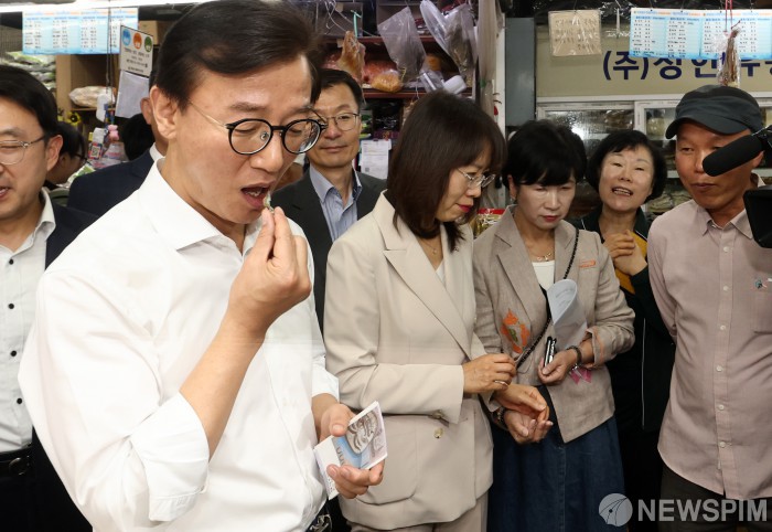 [서울=뉴스핌] 최지환 기자 = 전재수 해양수산부 장관이 1일 오후 서울 마포구 마포농수산물시장을 현장방문해 구매한 멸치를 맛보고 있다. 2025.10.01 choipix16@newspim.com