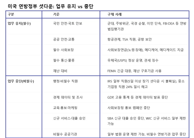 반면, 업무가 중단되거나 제한되는 부문으로는 비필수 행정 업무와 경제 데이터 발표, 교육·홍보 활동 등이 있다.